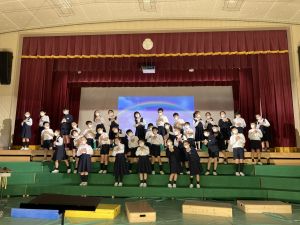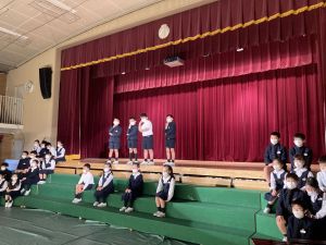 自分たちだけで練習するのではなく、誰かに見られることで、本番に近い緊張感をもって、取り組むことができます。子どもたちは、1年生が見に来ると聞き、「頑張るぞー!」と気持ちを高めていました。舞台前の教室練習では、いつも以上にやる気に満ち溢れ、大きな声がどのクラスからも聞こえてきました。舞台に立った子どもたちは、どこか緊張している様子でした。さあ、1年生にどんな演技を見せることができるでしょうか。