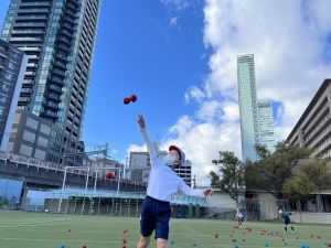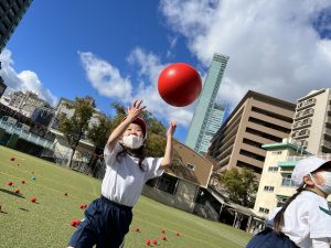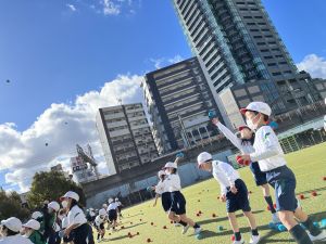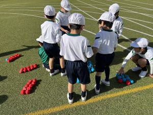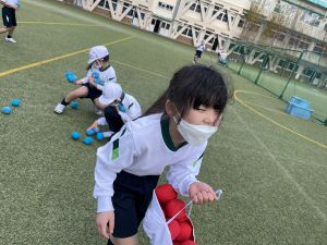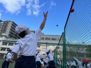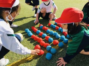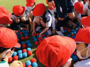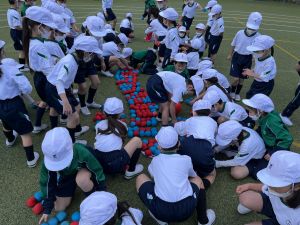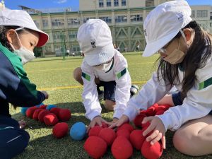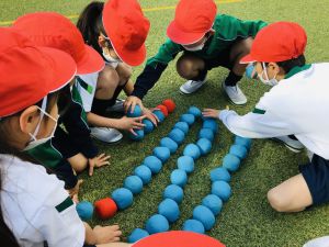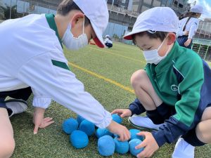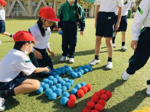 相手コートに玉を多く投げ入れた方が勝ち、というゲームを通して、「投」の遊びに親しみました。そのボールの多いこと。100個は超えています。こんな時に活かせるのが算数「20より大きい数」で学習した、”10のまとまりで捉える”という数え方です。算数で学んだことを、体育で活用して出した結果は・・・!?