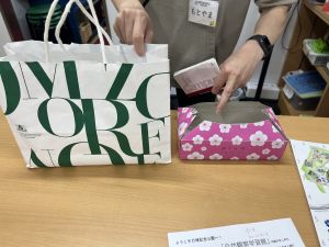 壊れる心配がある場合はテッシュ箱を写真のように切って持たせてください。紙袋の大きさはテッシュ箱が入る大きさでお願いします。(紙袋はバスに置いてニフレルに行きますので、出発時は手に持って行きます。)