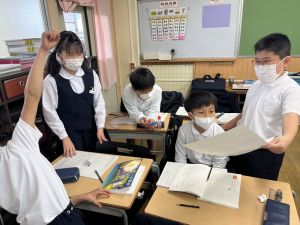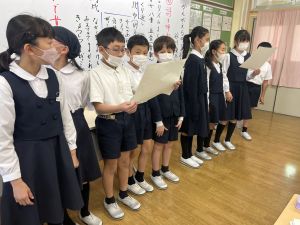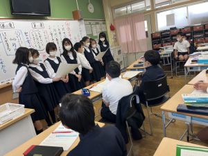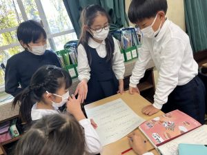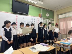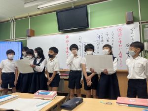 また、今回の課題は「表現する」ということでゲーム感覚の音読遊びから、班で相談してミニ発表会をしました。声の強弱、抑揚、速度、今回の詩から味わったことや、ふさわしいと思う読み方など、どの班も表現しようとする姿勢がたくさん見られました。