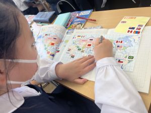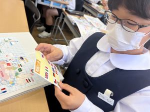 社会では国旗シールを使って世界地図を完成させました。「こんなのもあるんや!」「この二つの国旗にてる!なんでやろ?」これからの学習に活かせそうな「?」の芽がたくさん出ていました。