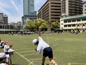 この3つのポイントを意識して投げることで、遠くへ投げることができます。少しの時間、近い距離・遠い距離でキャッチボールをしました。初めは、なかなか遠くへ投げられなかった人も、「コツを掴めてきた!」「さっきよりも遠くへ投げられた!」と喜ぶ姿がたくさん見られました。どれくらい投げられたかな?お家に帰ったら、お子様に聞いてあげてください。