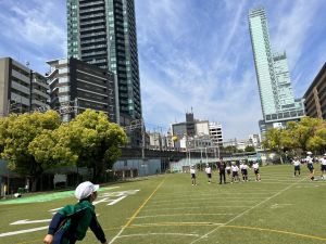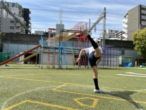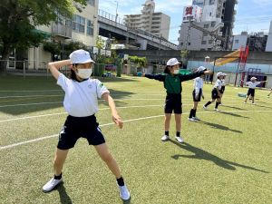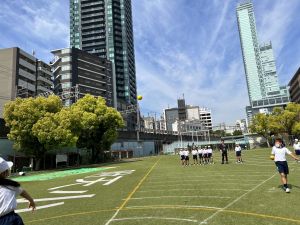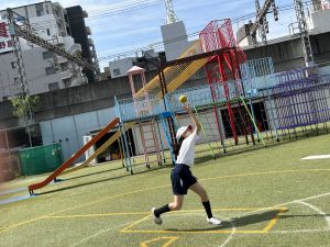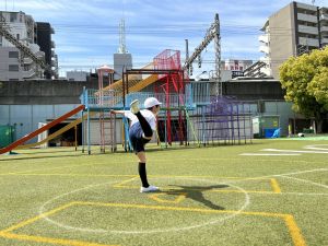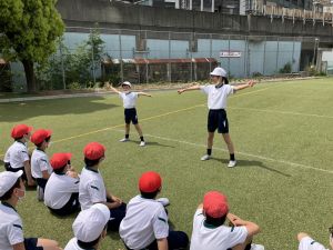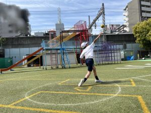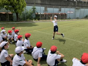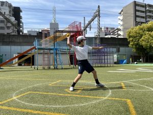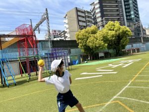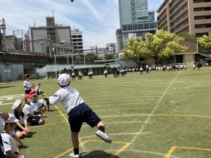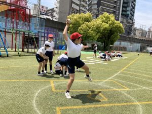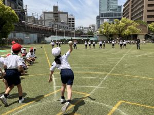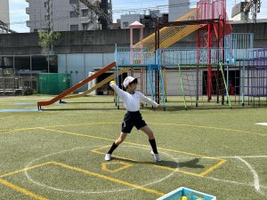 この3つのポイントを意識して投げることで、遠くへ投げることができます。少しの時間、近い距離・遠い距離でキャッチボールをしました。初めは、なかなか遠くへ投げられなかった人も、「コツを掴めてきた!」「さっきよりも遠くへ投げられた!」と喜ぶ姿がたくさん見られました。どれくらい投げられたかな?お家に帰ったら、お子様に聞いてあげてください。