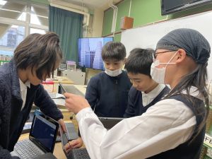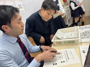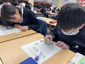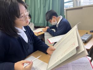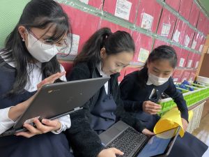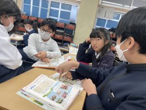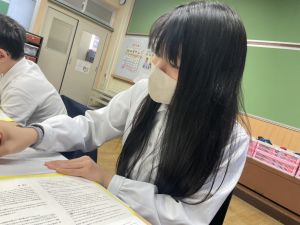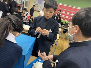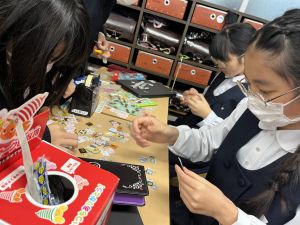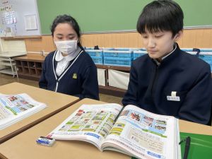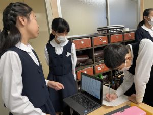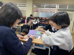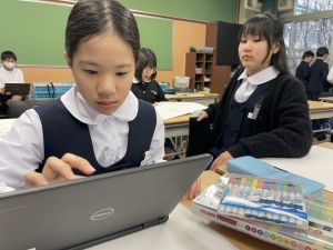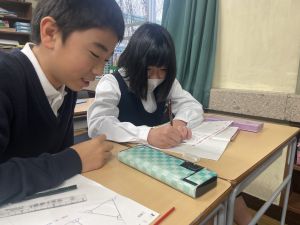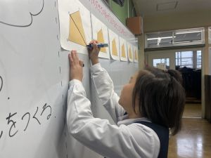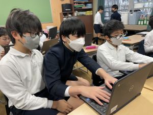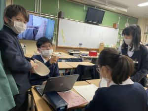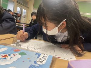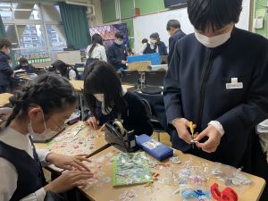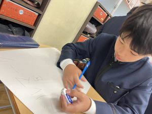 総合は、SDGsプロジェクトの続きです。ポスターの作成やダンボール箱を利用したものづくりなど、工夫を凝らして自分たちにできることを徐々に形にしていっています。