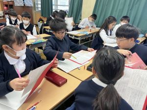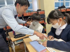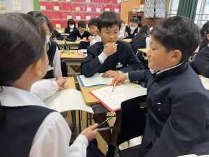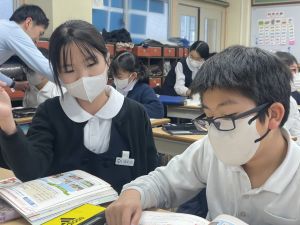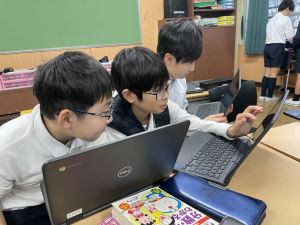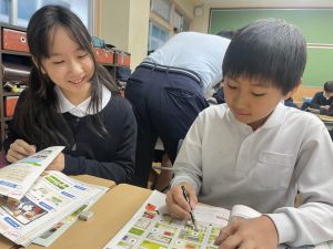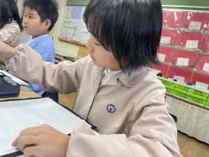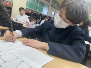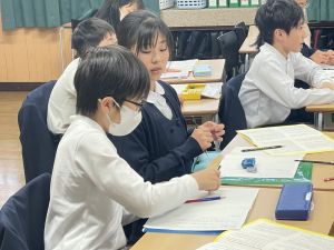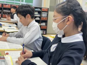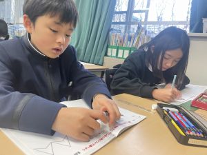 外国語は、道案内の続きです。今日もペアになり、お互いに表現を駆使して道案内をしました。後半はライティングの練習。話すことについてはかなり力がついてきた子どもたち。6年生や中学校を見据えて、書く力も高めていきたいところ。日本語とは違った表記に戸惑いや難しさもありますが、一つひとつクリアしていきましょう!