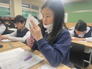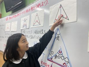 算数は、図形の角の学習です。対角線や補助線、平行線の活用など、図形の学習らしい子どもたちのアプローチに感心します。図形の学習はやわらかい発想が大切です。「そんなところに補助線を引っ張るのか」「ここに平行線を引っ張ると向かい合った角の性質が使える」など、子どもたちなりの柔軟な思考が図形の学習を豊かにしてくれます。そうした算数のメガネを通して図形を眺めていきたいですね。
