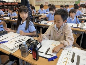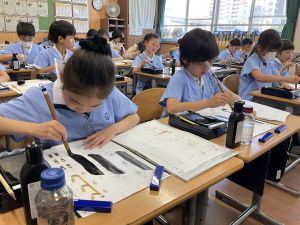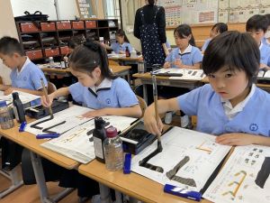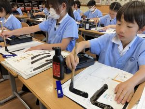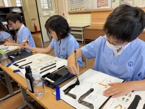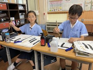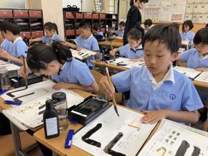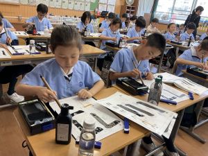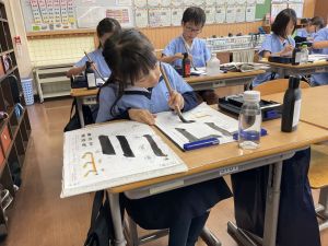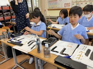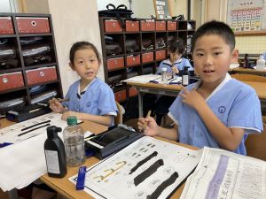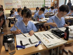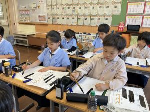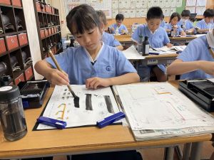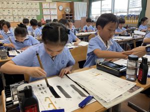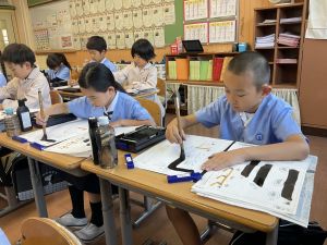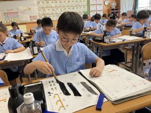 書写の学習では,よこ画に続き,たて画の練習をしました。