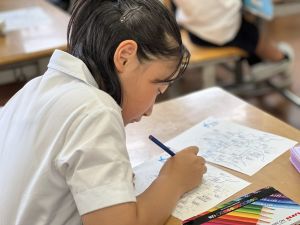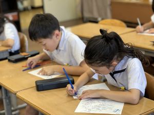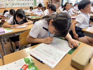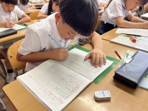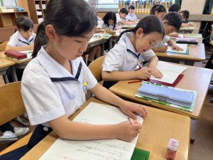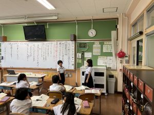 国語科の学習では、「もっと知りたい、友だちのこと」を学習しています。話を聴く上で大切なこと「うめらいす」(「う」なずいて「め」を見て「ら」すとまで「い」っしょうけんめい「す」まいるで)を意識することを確認しました。実際にペアで簡単なテーマでトークしながら、相手が話しやすい聞き方とはどのような態度か、また聞き終わった後にどのような質問をすると、さらに相手のトークを引き出すことができるのかを学習しました。