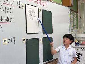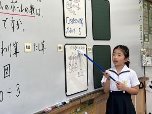 3組の算数科の学習では「答えが九九にないわり算」について考えました。答えが九九にないということは・・・「九九にある数をもとに考えたらいいのか」「いつもみたいに九九表は使えないけど、でも数を分けたら使えるよね」等,これまでに学習した内容を一生懸命に使いながら考えてくれていました。