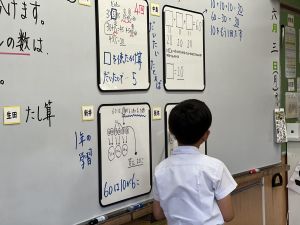 1組の算数の学習では「答えが九九にないわり算」についてさらに考えました。これまでの学習とちがうことは何かな?これまでの学習で使えることは何かな? 今日も頭をフル回転させながら,考えてくれていました。