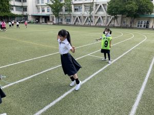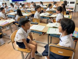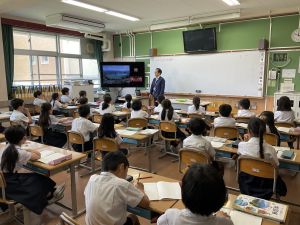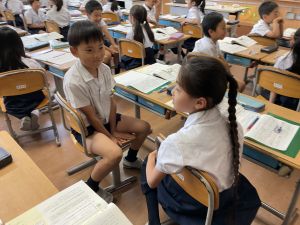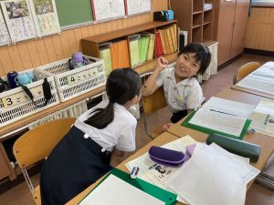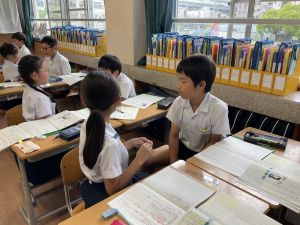 国語科の学習では、「もっと知りたい、友だちのこと」を学習しています。話を聴く上で大切なこと「うめらいす」(「う」なずいて「め」を見て「ら」すとまで「い」っしょうけんめい「す」まいるで)を意識することを確認しました。実際にペアで簡単なテーマでトークしながら、相手が話しやすい聞き方とはどのような態度か、また聞き終わった後にどのような質問をすると、さらに相手のトークを引き出すことができるのかを学習しました。