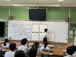 3組の算数科の学習では「答えが九九にないわり算」について考えました。答えが九九にないということは・・・「九九にある数をもとに考えたらいいのか」「いつもみたいに九九表は使えないけど、でも数を分けたら使えるよね」等,これまでに学習した内容を一生懸命に使いながら考えてくれていました。