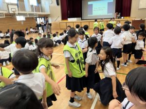 3時間の避難訓練の時間では,附属池田小学校の事件を教訓にしながら学習を進めていきました。もちろん,いざとなれば,我々教員は子どもたちを守りますが,「自分の身は自分で守る」ことも大切です。例えば,日頃より名札を着用したり,持ち物に記名をしたりすることの大切さ,加えて,なぜ移動教室の場合は静かに2列で移動をするのか,なぜ職員室で大きな声で挨拶と名前を伝えるのか等を合わせて学習しました。日頃から,教員が口を酸っぱくさせて言っていることは,いざという時に身を守るために大切なことなのです。