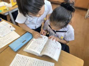 国語の学習では,「辞書引き」も行っています。意味を知らない言葉を調べたり,意味は知っているけれども改めて調べてみたり,調べる言葉はそれぞれです。調べた言葉には,付箋をはって,メキメキ語彙力をあげていきましょうね。