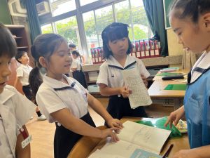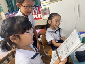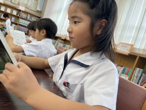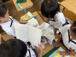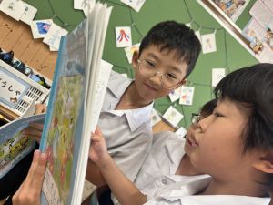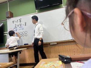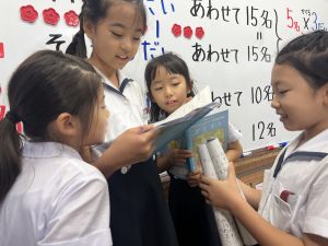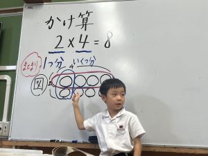 算数は「かけ算」です。「九九をもう知っているよ!」という人も、「いよいよだ!できるかな…」という人も楽しく理解できるように、”考え方”や”表し方”に注目して、身の回りとつなげながら学習を進めています。