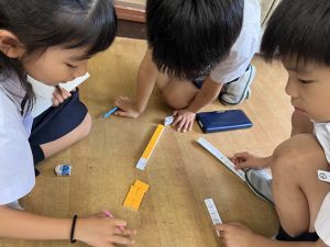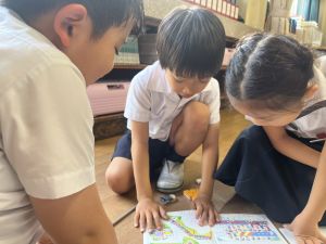 算数は、身の回りのかけ算を探したり、神経衰弱をしたり、遊園地で働いたり…。