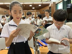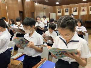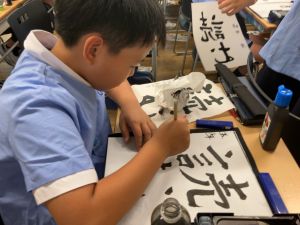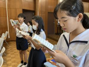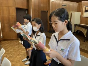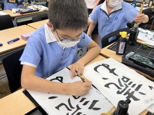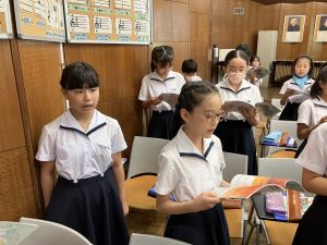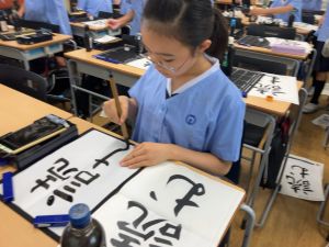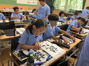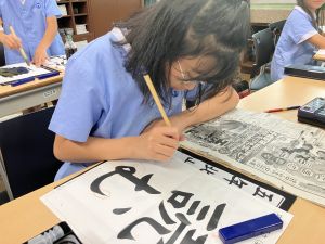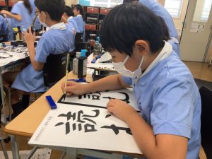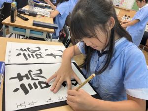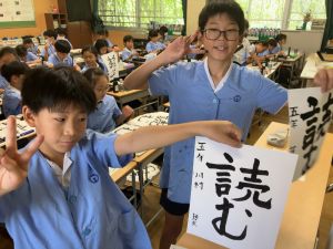 書写の学習では、新たに5年生の書写を教えてくださる松政先生と習字の「読む」を書きました。