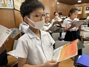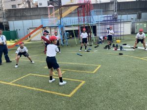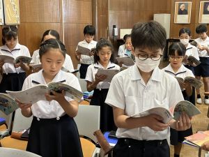 ① 明日は、8時45分から通学班集会があります。遅れないように登校しましょう。