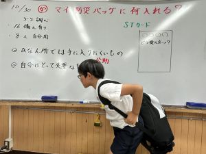 本日、総合の学習では,「マイ防災バッグに何入れる?」という課題に挑戦しました。