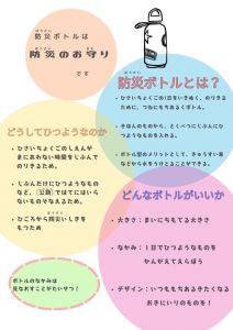 【お知らせとお願い】 1.総合の学習について 総合では災害に対して必要な備え1次避難について調べ学習を行っています。次回,15日STEAMDAYでは,集めた情報をもとに一人ひとり0次避難の備えについて考え「マイ防災ボトル」をつくります。