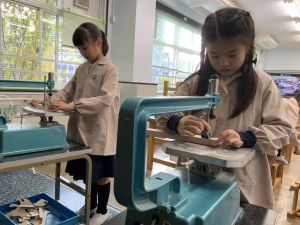 図工では、アート展に向けて、木材を設計し、切ることに挑戦しているクラス