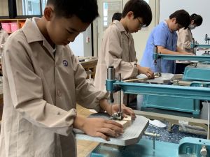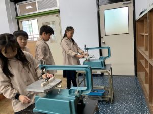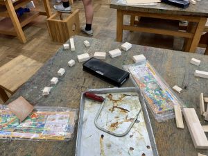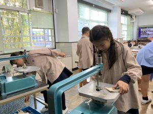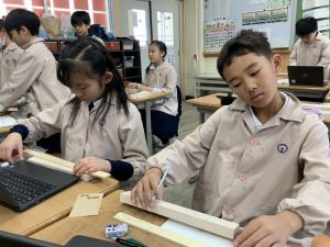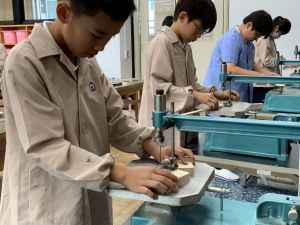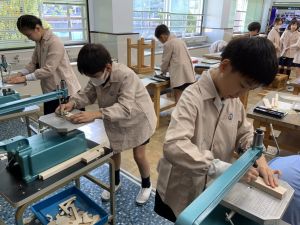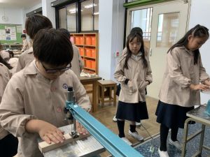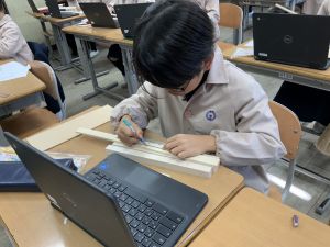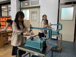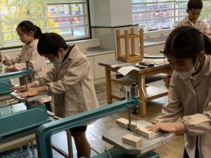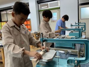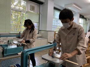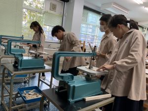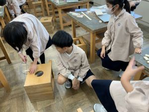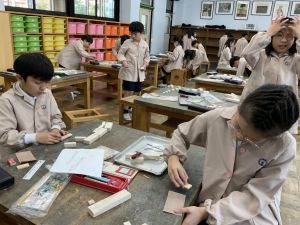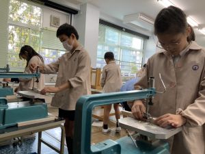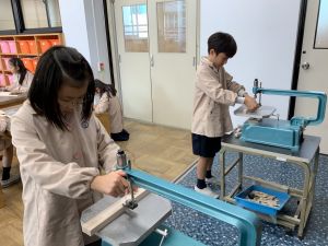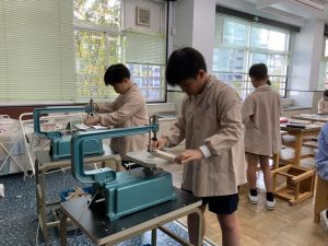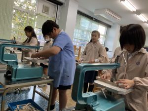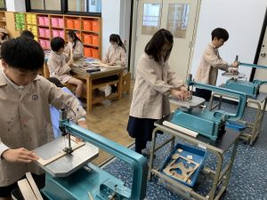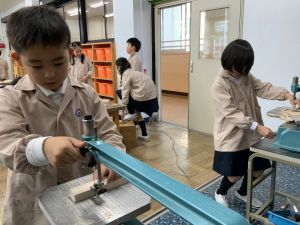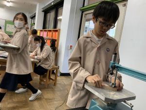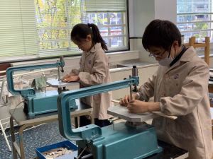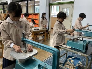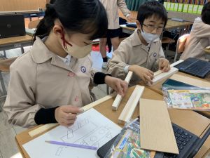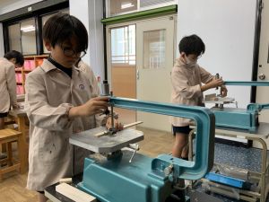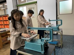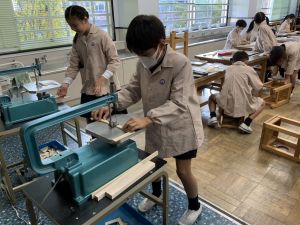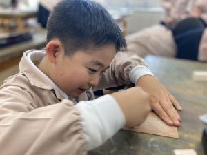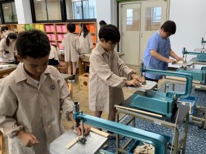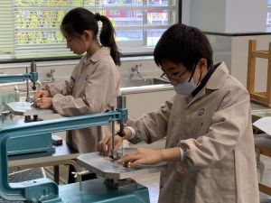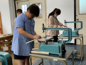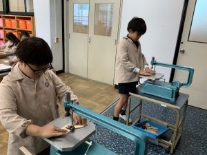 図工では、アート展に向けて、木材を設計し、切ることに挑戦しているクラス