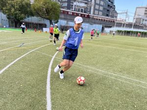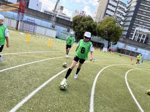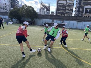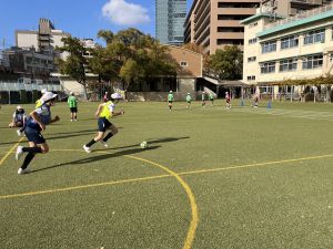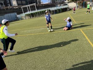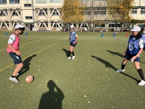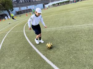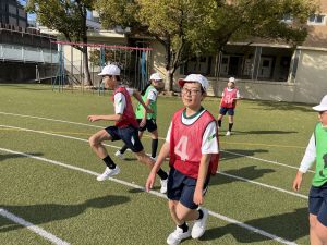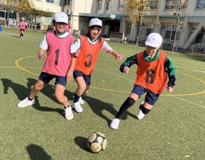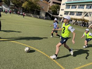 友達がシュートを決めると、手をたたいて喜ぶ。