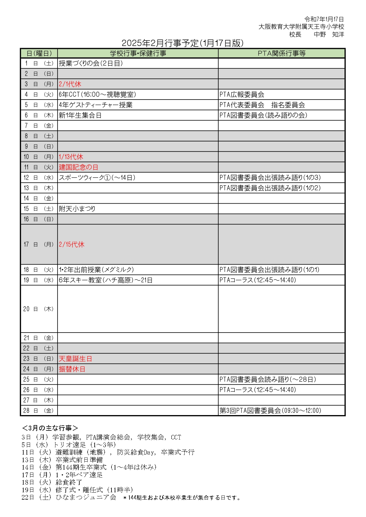 2025年2月行事予定(1/17版) 2025.01.17 行事関係 PDFは、こちら 2025.1月行事予定 « 前へ 一覧へ 次へ » 関連する記事 【再掲】3月11日(火)防災給食デーの食事内容について(必ずご確認ください) 2025.03.10 行事関係 令和7年度学校行事予定(案) 2025.03.03 行事関係 3月11日(火)の防災給食デーについて 2025.02.27 行事関係 附天小まつりについて 2025.02.14 行事関係 保護者専用 お知らせ 1年生 2年生 3年生 4年生 5年生 6年生 落とし物 各種募集 行事関係