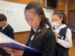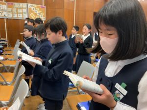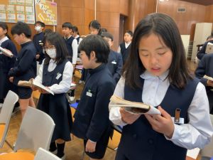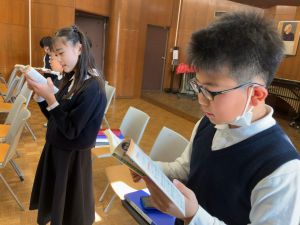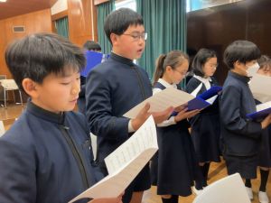 145期の5年生たちが校歌のアルトを歌います。当たり前のことですが、ソプラノを歌う144期生たちは、卒業式が皆で校歌を歌うのが最後となります。在校生代表として、来年の最高学年として、何より145期生としてふさわしい歌声を、練習の中でつくっていってくださいね。