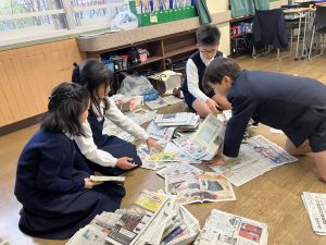 2組の教室で、社会科の学習に向けてみんなが持ってきてくれた新聞を新聞社ごとにまとめてくれている子たちを見つけました。