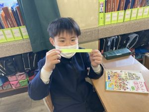 よく見てみると、ひとりひとりリボンの長さがちがうことに気付く子どもたち。