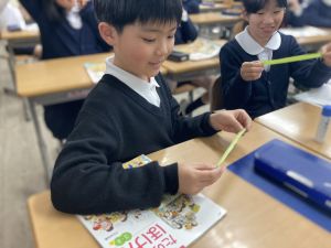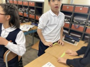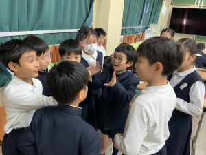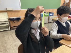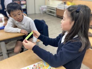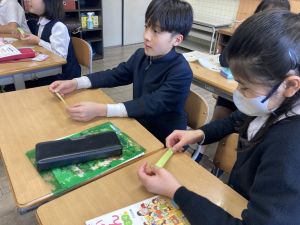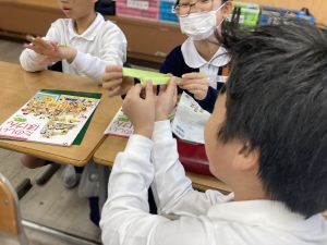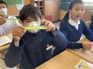 よく見てみると、ひとりひとりリボンの長さがちがうことに気付く子どもたち。