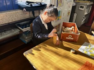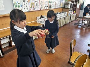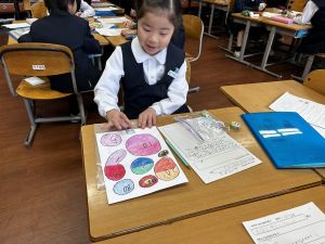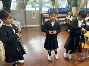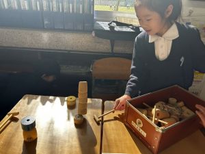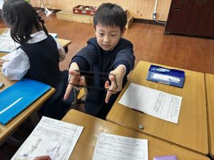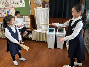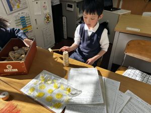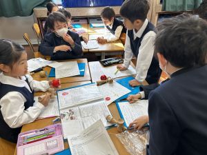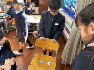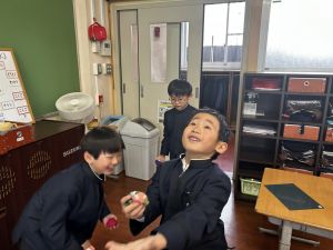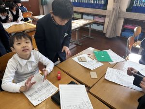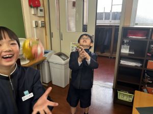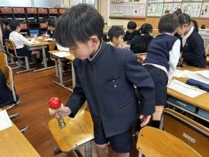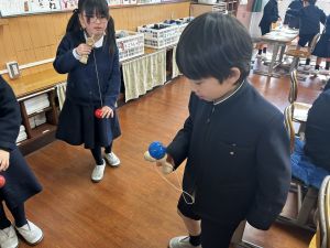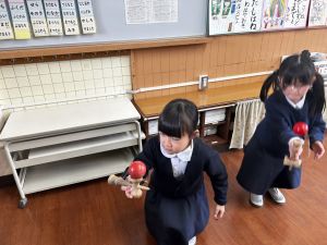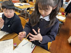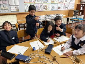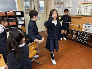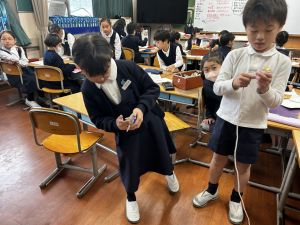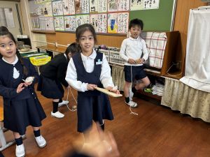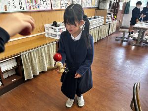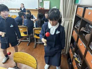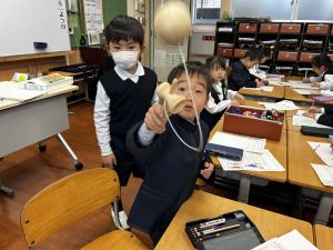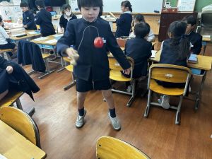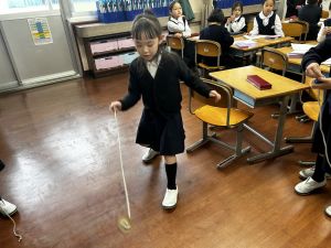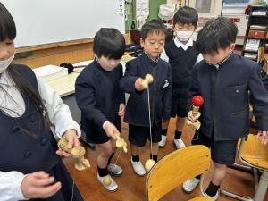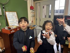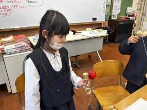 生活では「むかし遊び」の学習が進んでいます。今日は、学校にあるものだけでなく、家にあるものも持ち寄って体験する日となりました。まず”知ること”が大事です。知ってるよ、ではなく、やってみて面白さやよさがわかることが大事です。中には、体験するだけでなく、好きになって、得意になって、名人になって、遊び方の工夫まで自分で始める子も出てくることでしょう。