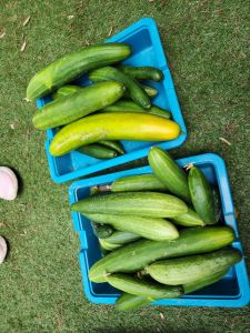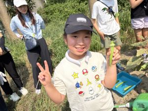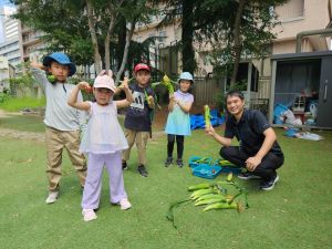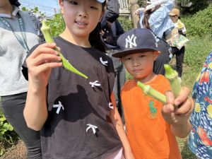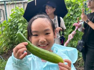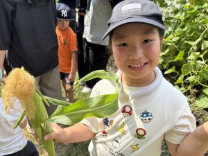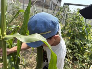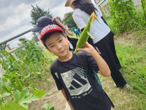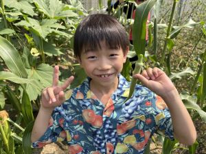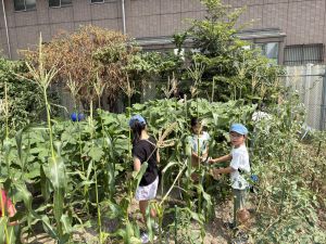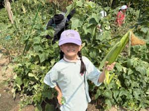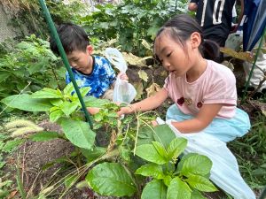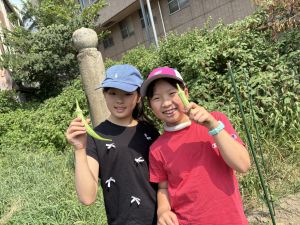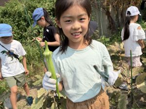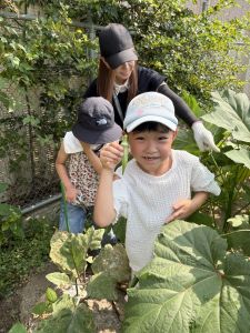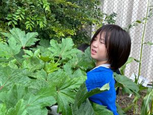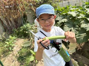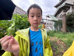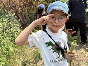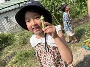 今日、ふくろうガーデンで野菜の水やりをしているときに、かわいいお客さんがいました。何でしょうか?