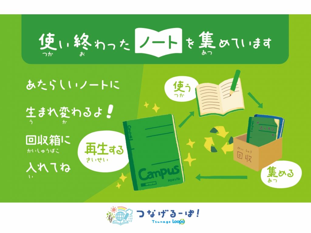 使いおわった、不要なノートを回収して、再びノートの材料とする「つなげるーぱ!」の活動に参加することとしました。
