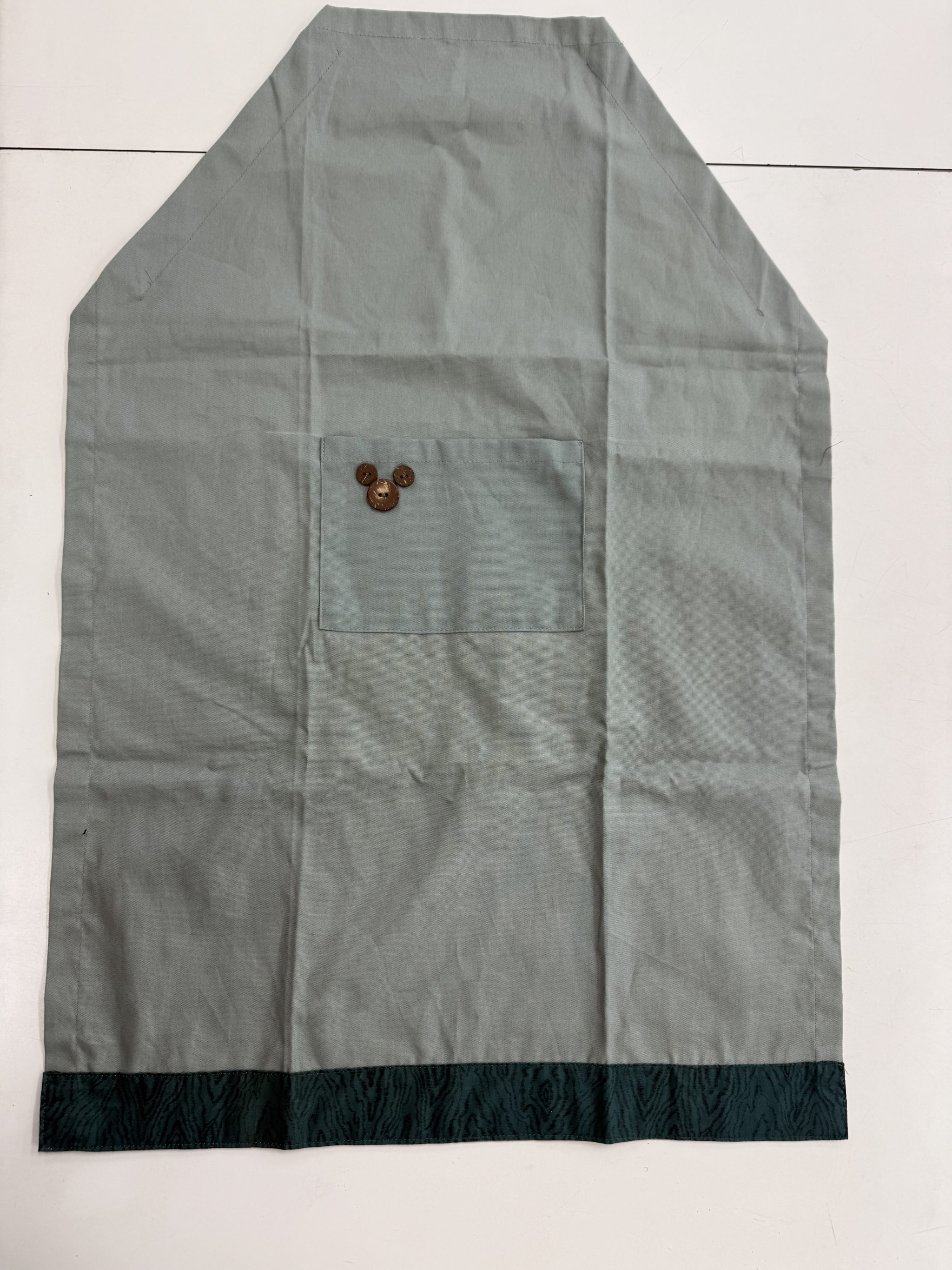 エプロンは、各自で選んだデザインのものを制作しますが、時間に余裕がある場合は、飾りボタンやアップリケ、布、レースなどで飾り付けを行ってもかまいません。もし、飾り付けをしたい場合は、「自宅で不要になった服についているボタンやレース、古着の布、等をもってきてもいいよ。」と話しています。わざわざ購入していただく必要はありませんが、もし、お子さんが、エプロンの飾りについて、おうちで相談をした場合、サポートを(もちろん、エプロンにはすでに絵柄もあるので、飾り付けをする必要がない場合もありますし、そもそも、エプロンをつくるだけで精一杯!という状況かもしれません。そのあたりも、子どもたちに伝えています。下写真は、私が自宅でつくったものです。ボタンと、服の布で簡単に飾りをつけました。)