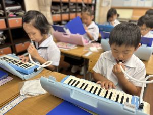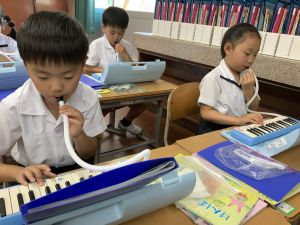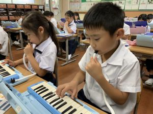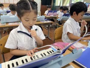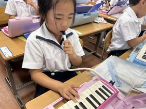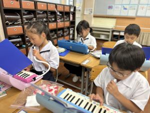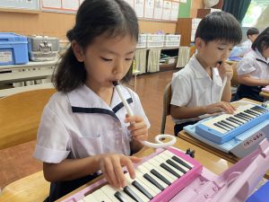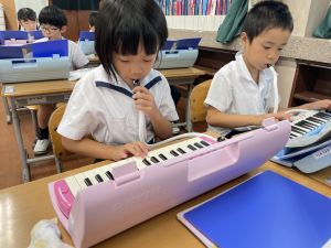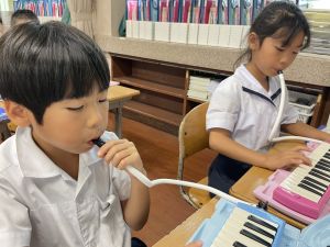 夏休みに鍵盤ハーモニカの宿題を出しており、今日初めてお友達と音を揃えました。