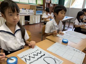 何もかも初めての道具ばかりでもう大変!水でいろいろな線を楽しく書きました。