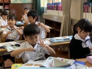 音楽の時間に新しい楽器を少しずつ練習しています。今日はトライアングルの正しい持ち方・音の違いを学習しました。