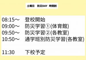 【お知らせとお願い】 1.明日について 明日は、学芸会楽器オーディションです。よろしくお願いいたします。 2.土曜授業 防災DAYについて 今週土曜日は、防災DAY 授業です。以下、時間割をご確認下さい。 |