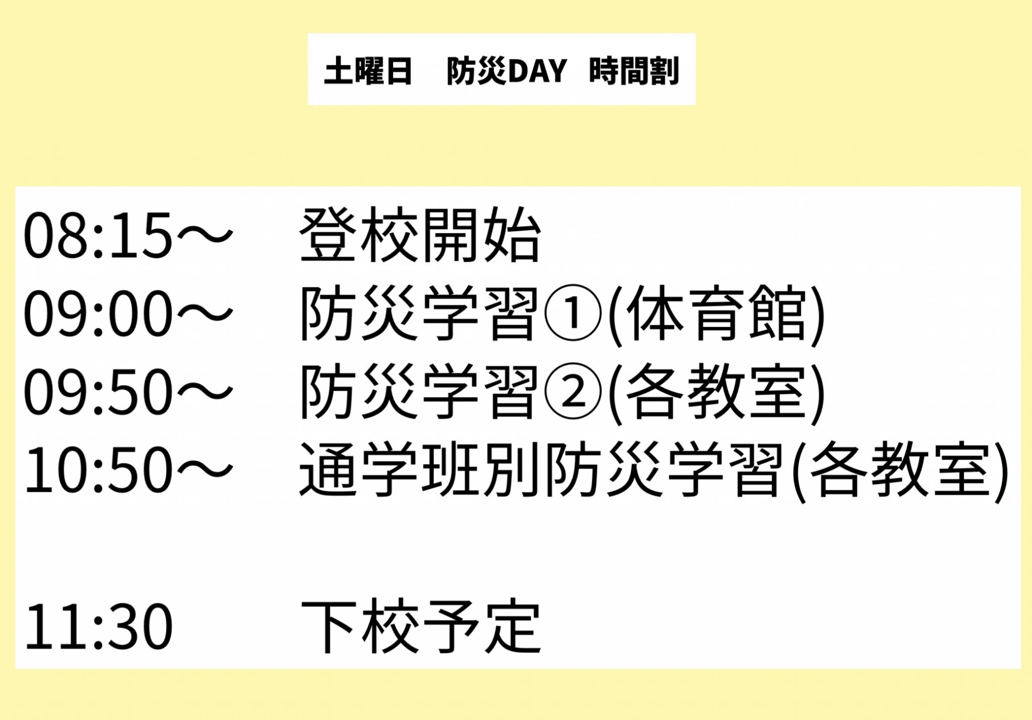 【お知らせとお願い】 1.明日について 明日は、学芸会楽器オーディションです。よろしくお願いいたします。 2.土曜授業 防災DAYについて 今週土曜日は、防災DAY 授業です。以下、時間割をご確認下さい。 |