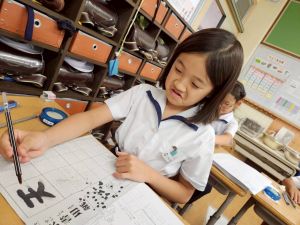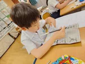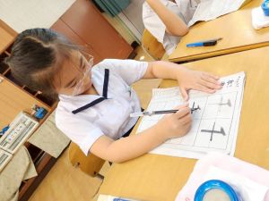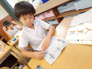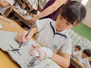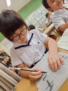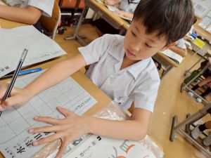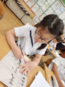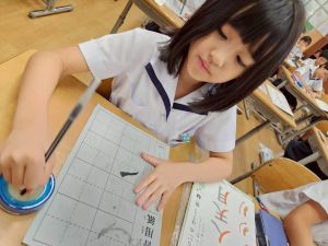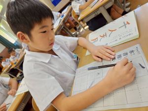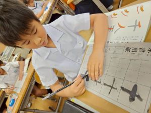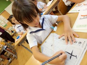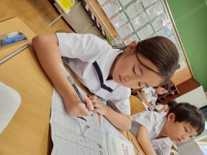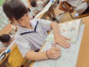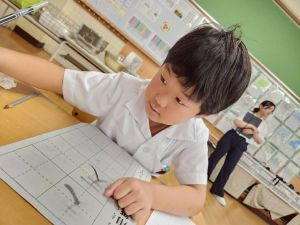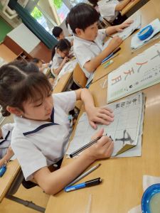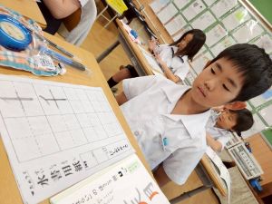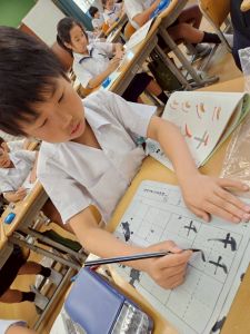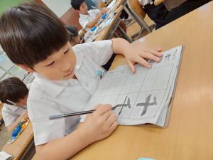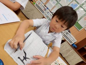 今日は、けのびのような『はらい』、重ねてすべり台のような『はらい』、ジェットコースターのような『はらい』を水筆、鉛筆で練習しました。