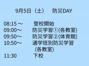 お知らせ 〇土曜参観について 土曜日防災DAYの日程と活動場所になります。ご確認ください。