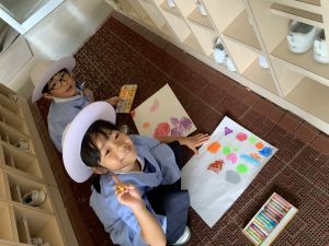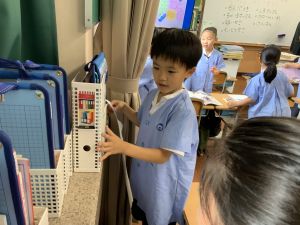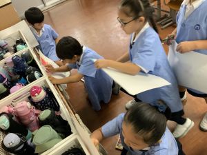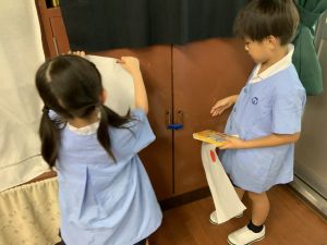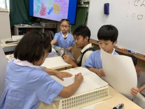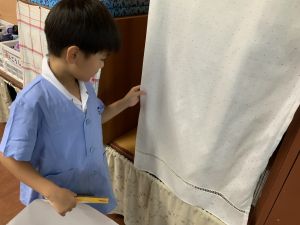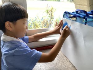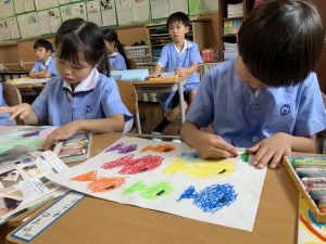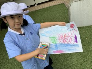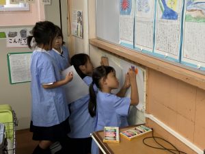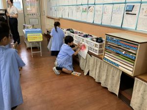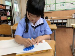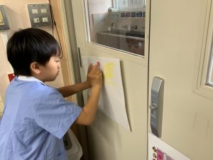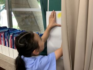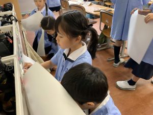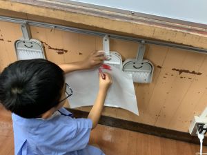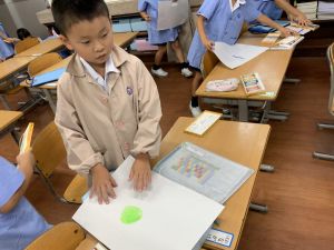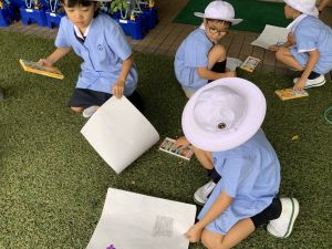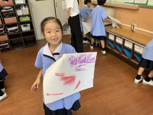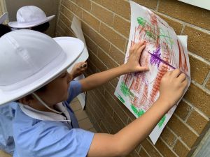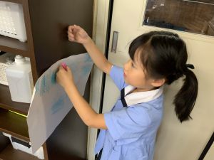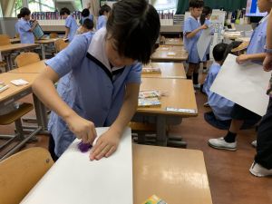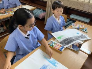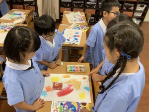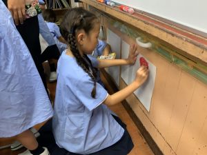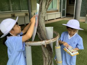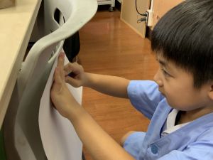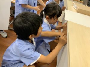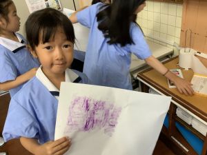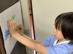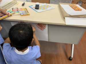 そのまま紙とクレパスを持って,教室中を探検。見つけてすぐに紙を当てて擦ってみる子,手で触って凸凹の感触を感じてから擦り始める子,擦る力加減を調整して模様の違いを比べる子などあちこちで工夫する姿が見られました。