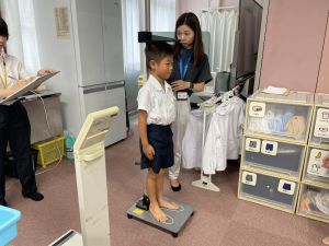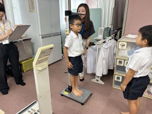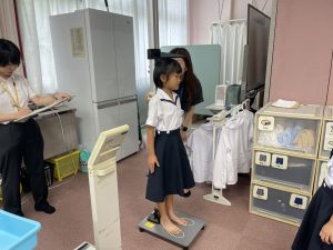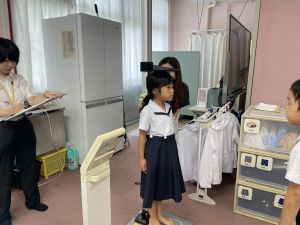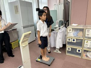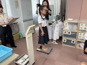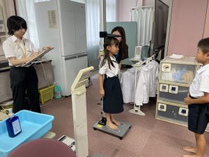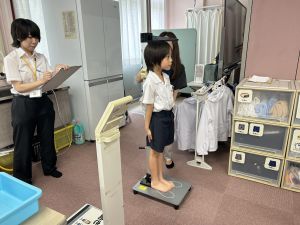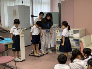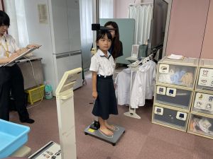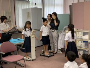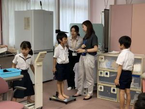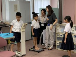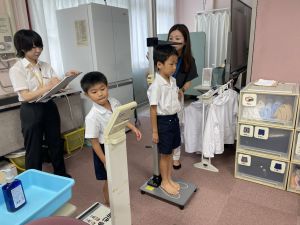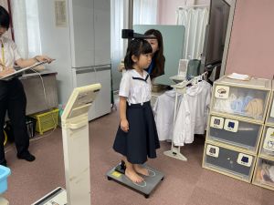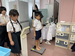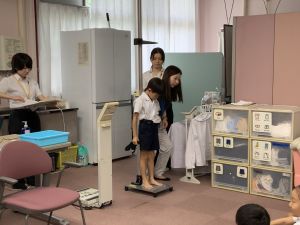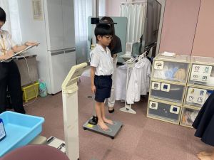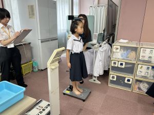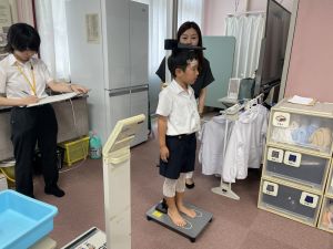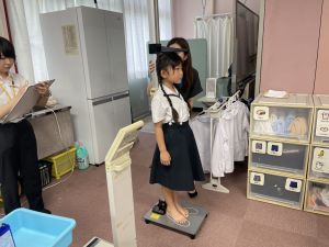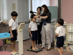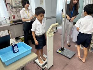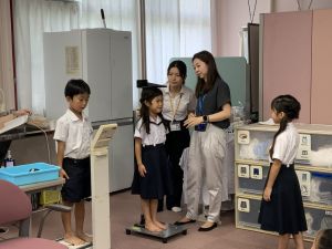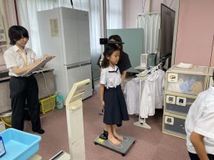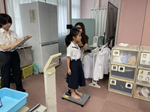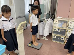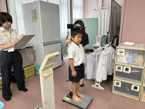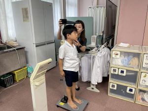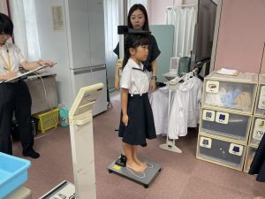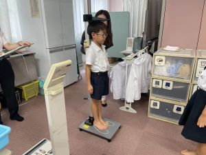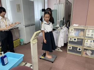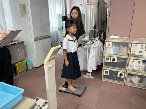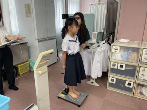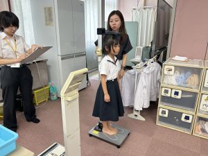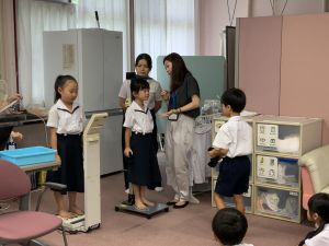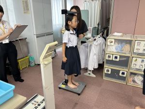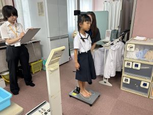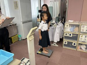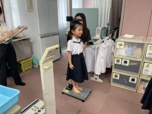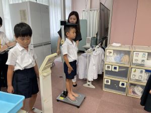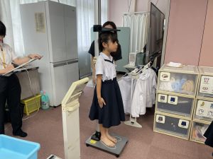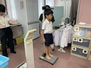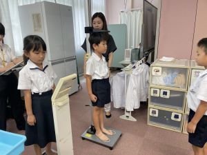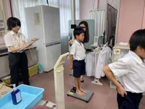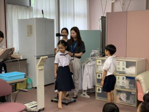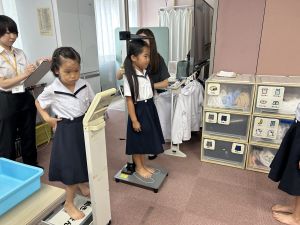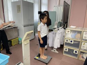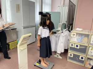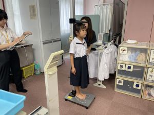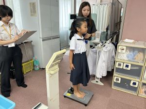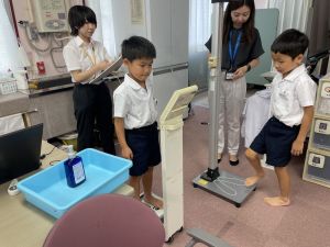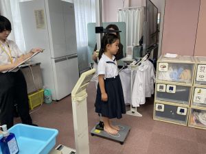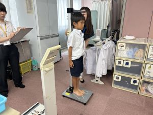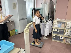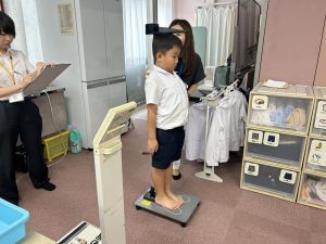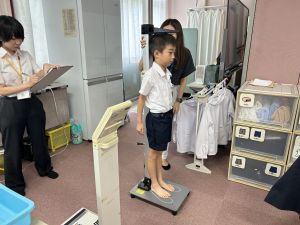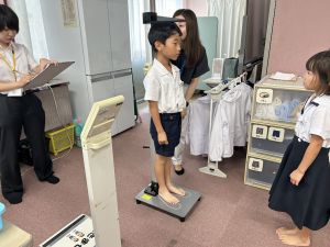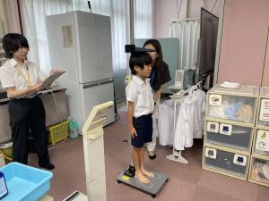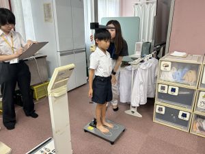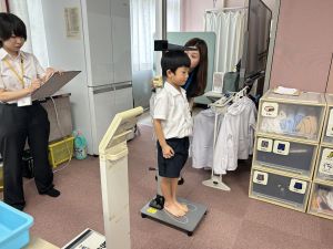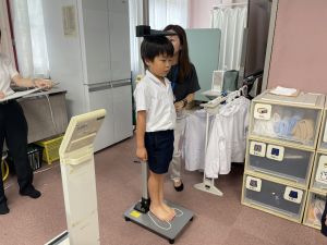 身長も体重も前回より伸びている子が多く、成長を感じる時間となりました。とはいえ、1年生の子どもたちは、自分の身長が伸びたことをまだ実感できない様子で、湊川先生から身長を伝えられても「キョトン」としている姿が見られました。その反応も、1年生ならではの可愛らしさです。