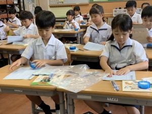 毛筆の筆の持ち方になったり手首まで浮かして書いたり,4月に学習した鉛筆の持ち方を忘れていたり…一度身についてしまった習慣の治しにくさに子どもたちは四苦八苦な様子です。「鉛筆と同じだから魔法のアイテムを使うといいよ。」松政先生のこの言葉も魔法の言葉。アイテムを使うと途端に美しい持ち方の子が増えました。