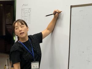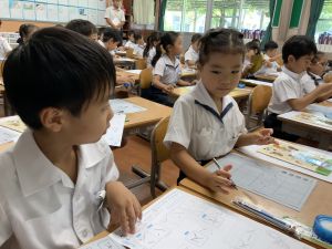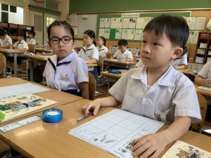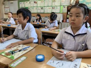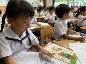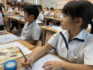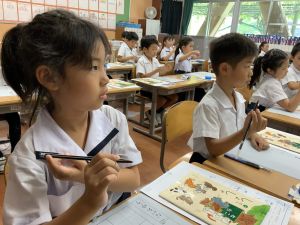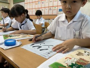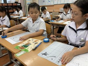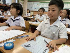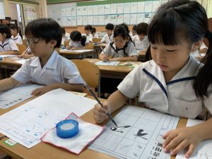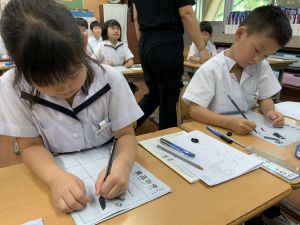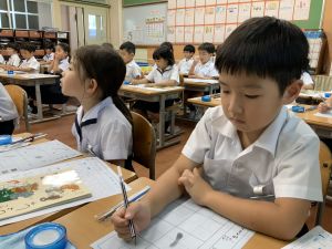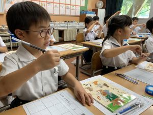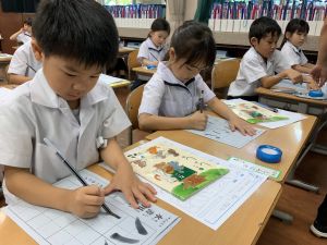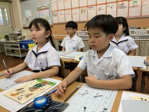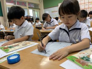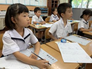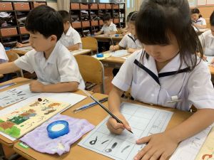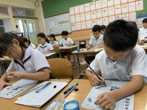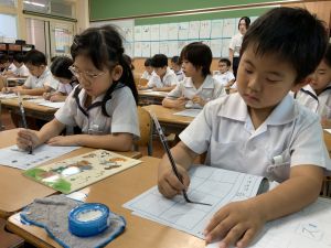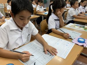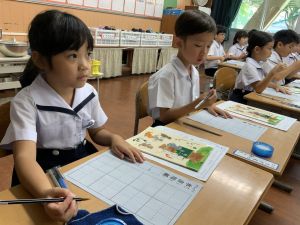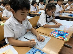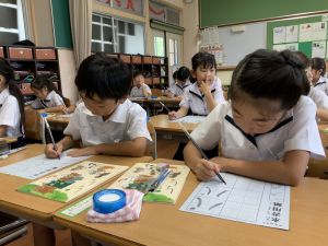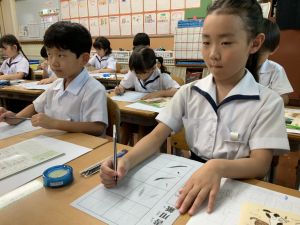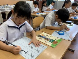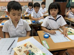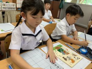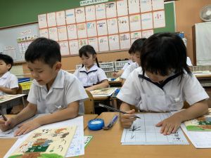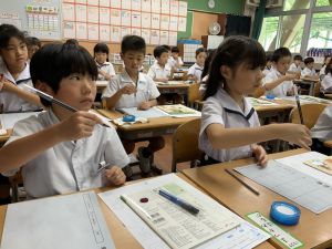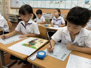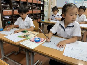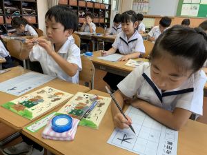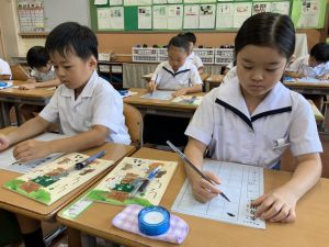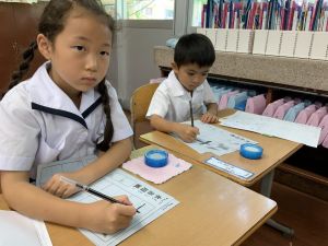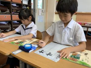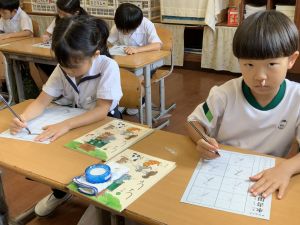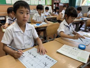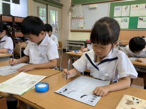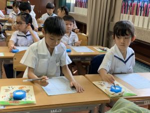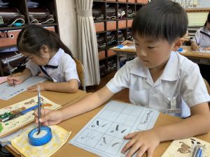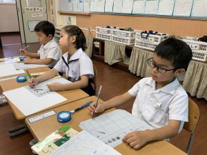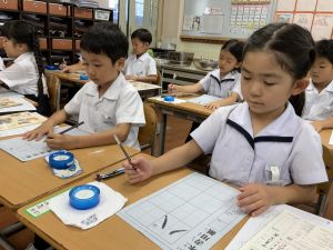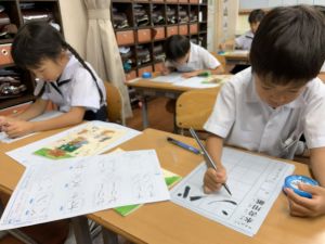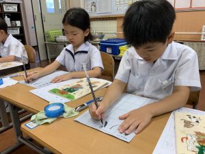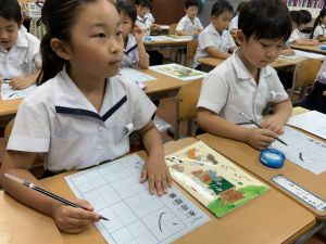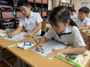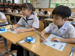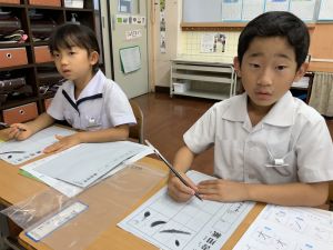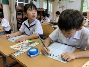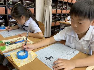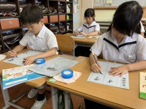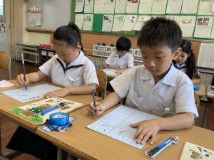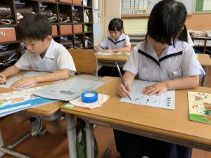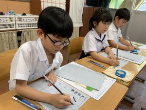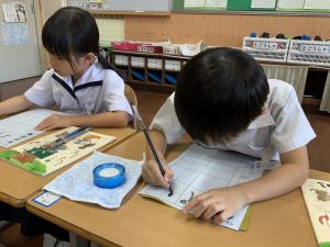 毛筆の筆の持ち方になったり手首まで浮かして書いたり,4月に学習した鉛筆の持ち方を忘れていたり…一度身についてしまった習慣の治しにくさに子どもたちは四苦八苦な様子です。「鉛筆と同じだから魔法のアイテムを使うといいよ。」松政先生のこの言葉も魔法の言葉。アイテムを使うと途端に美しい持ち方の子が増えました。