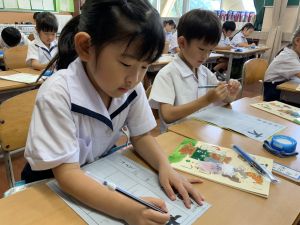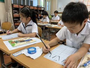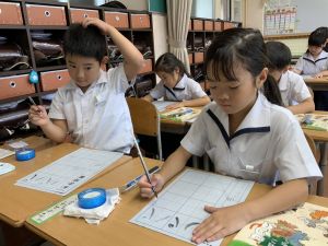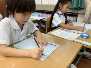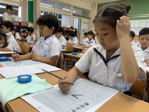 始まりの「書く姿勢」も「持ち方・使い方」も繰り返し整えていく大切さを実感する書写の時間でした。いつでも美しい文字が書けるように,水書も硬筆も正しく丁寧に励みましょう。
