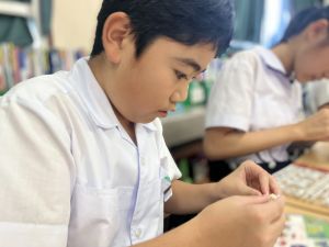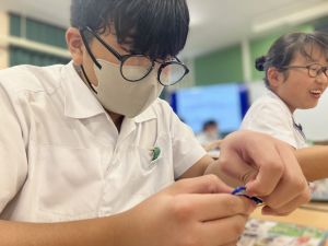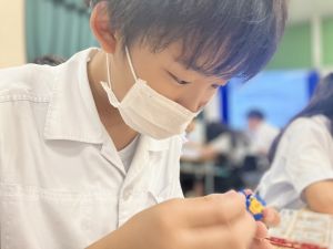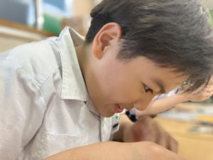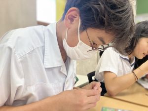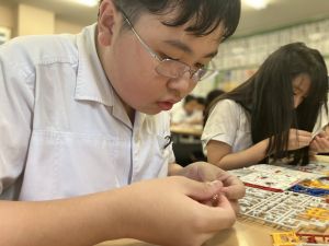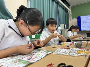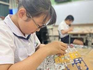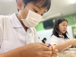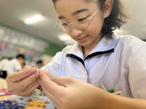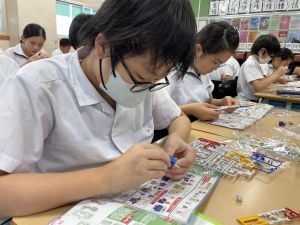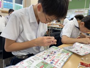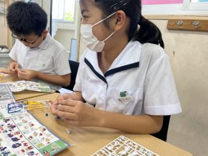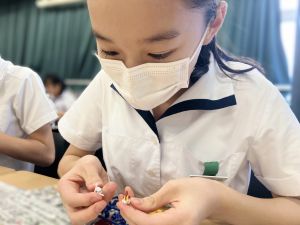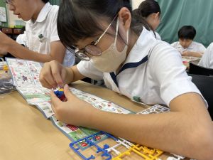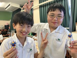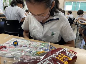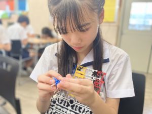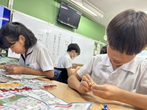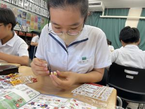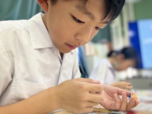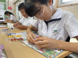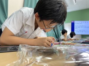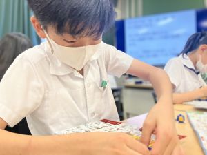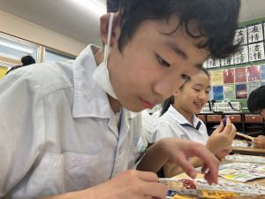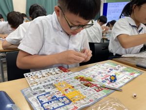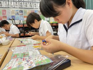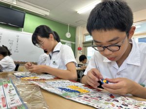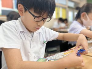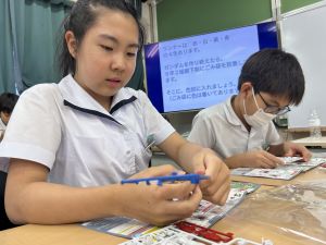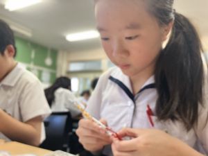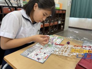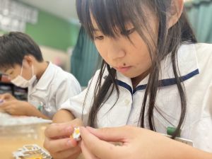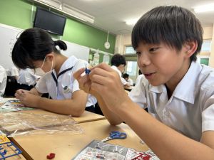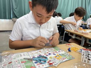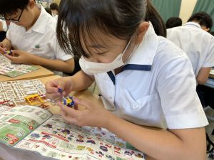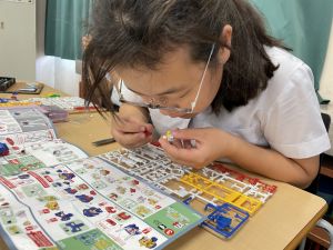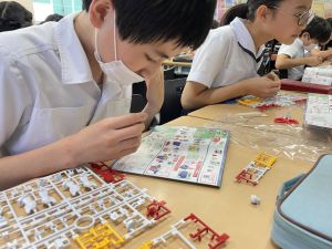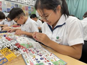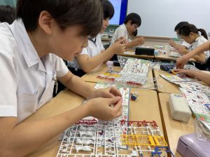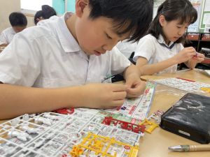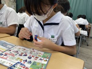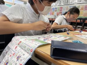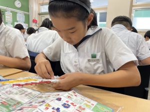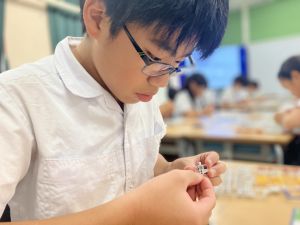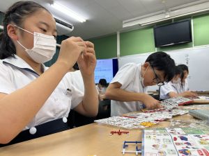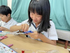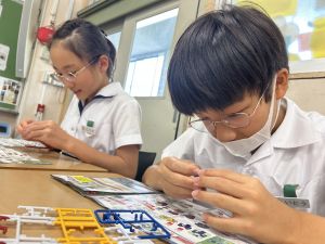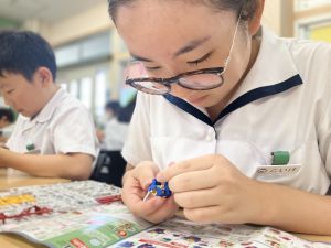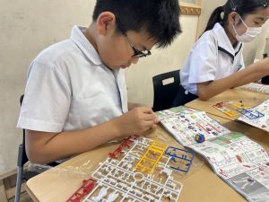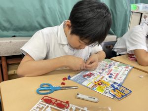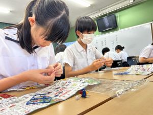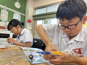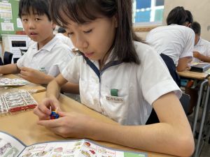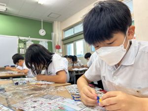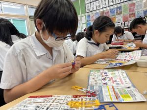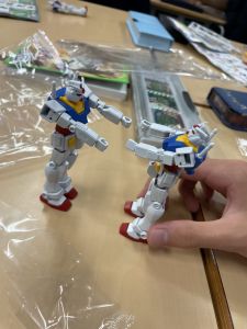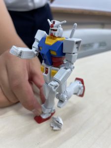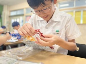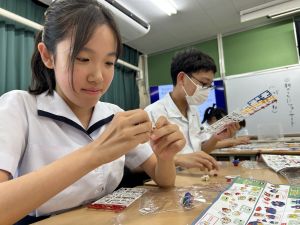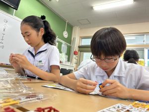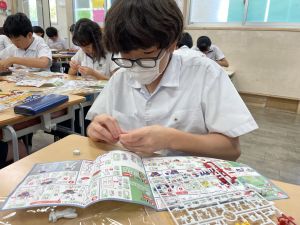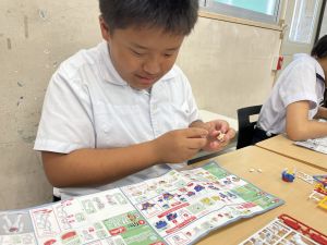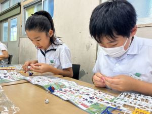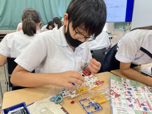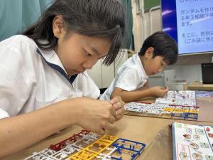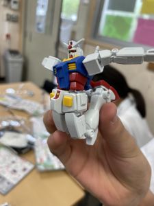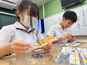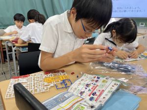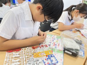 5時間目は、リサイクルの一環として「ガンダムのプラモデル作り」を体験しました。プラモデルには必ず「ランナー」と呼ばれる余りの部品が出ます。通常はゴミとなるこのランナーをリサイクルし、新たなプラモデルに生まれ変わらせる取り組みについて学びました。初めて作る児童も多く、真剣に、そして楽しくプラモデル作りに取り組む姿が印象的でした。