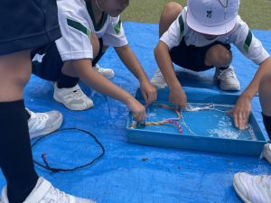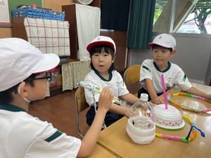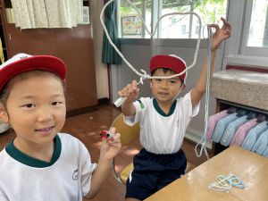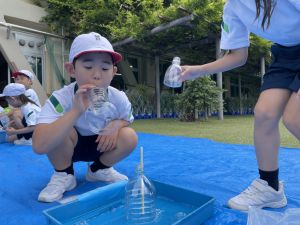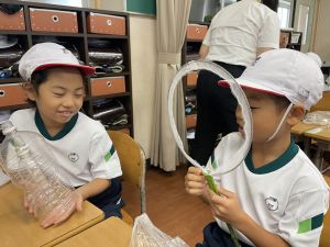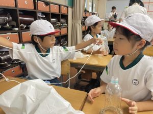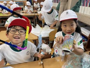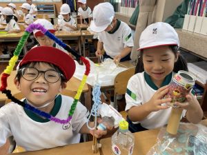 もっと大きいしゃぼん玉が作れるようにそれぞれが工夫して持ち寄りました。